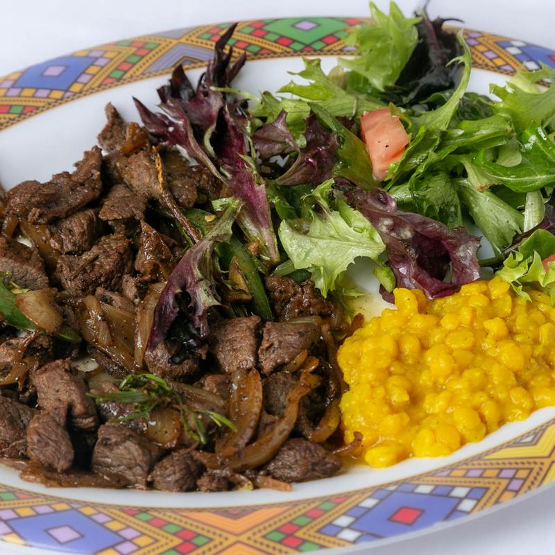 Sliced prime tender beef with a touch of garlic, onion & fresh tomato. Served with pieces of enjera $20.95 | $21.95