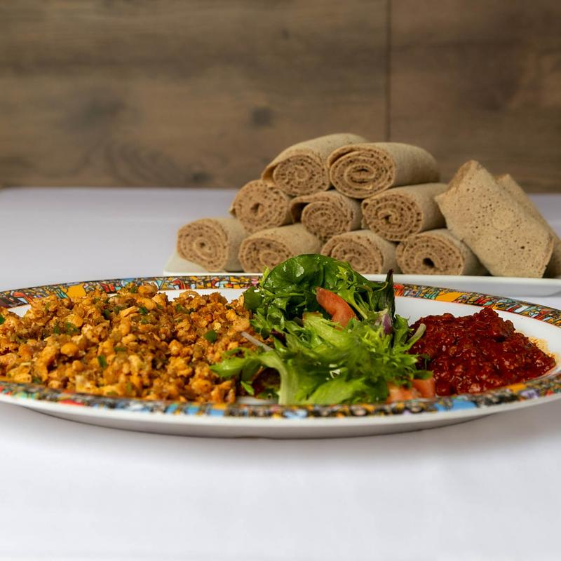 Finely chopped beef blended with butter & Ethiopian spices. Served with gomen, Ayib (freshly made cottage cheese).