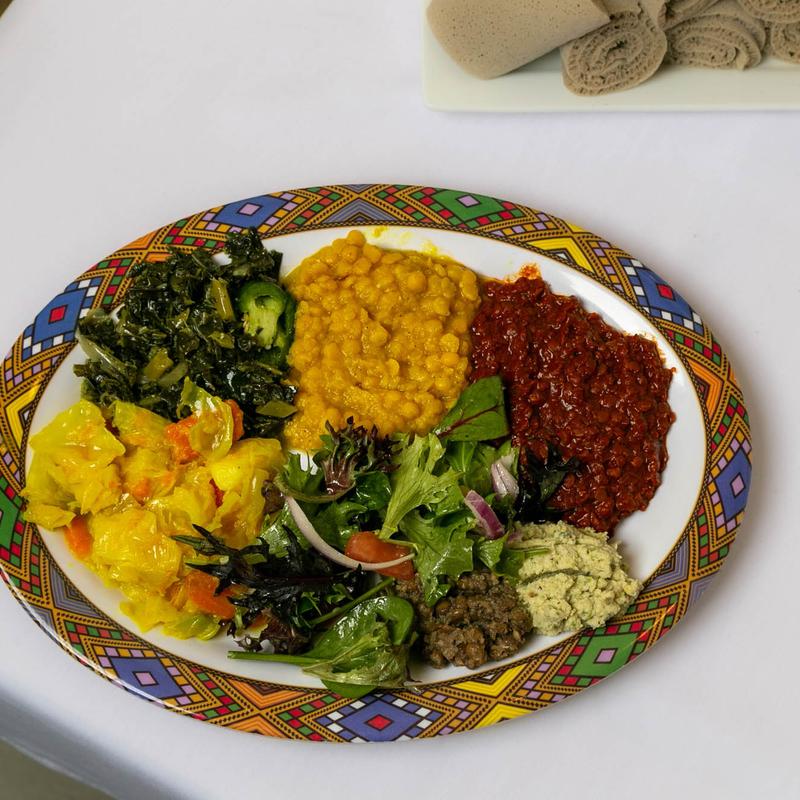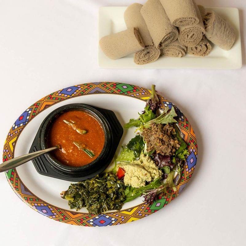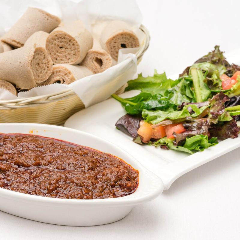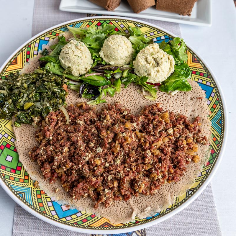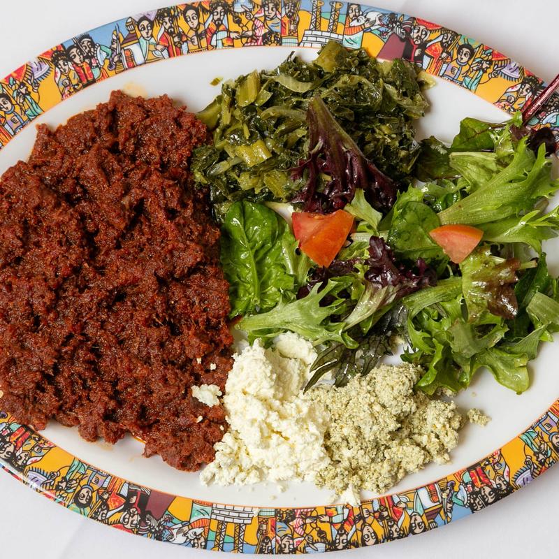 Finely chopped prime and lean beef seasoned with purified butter, mitmita & cardamom, ayib & gomen.